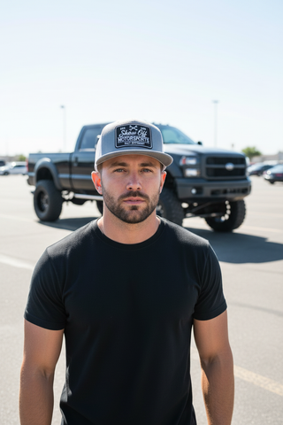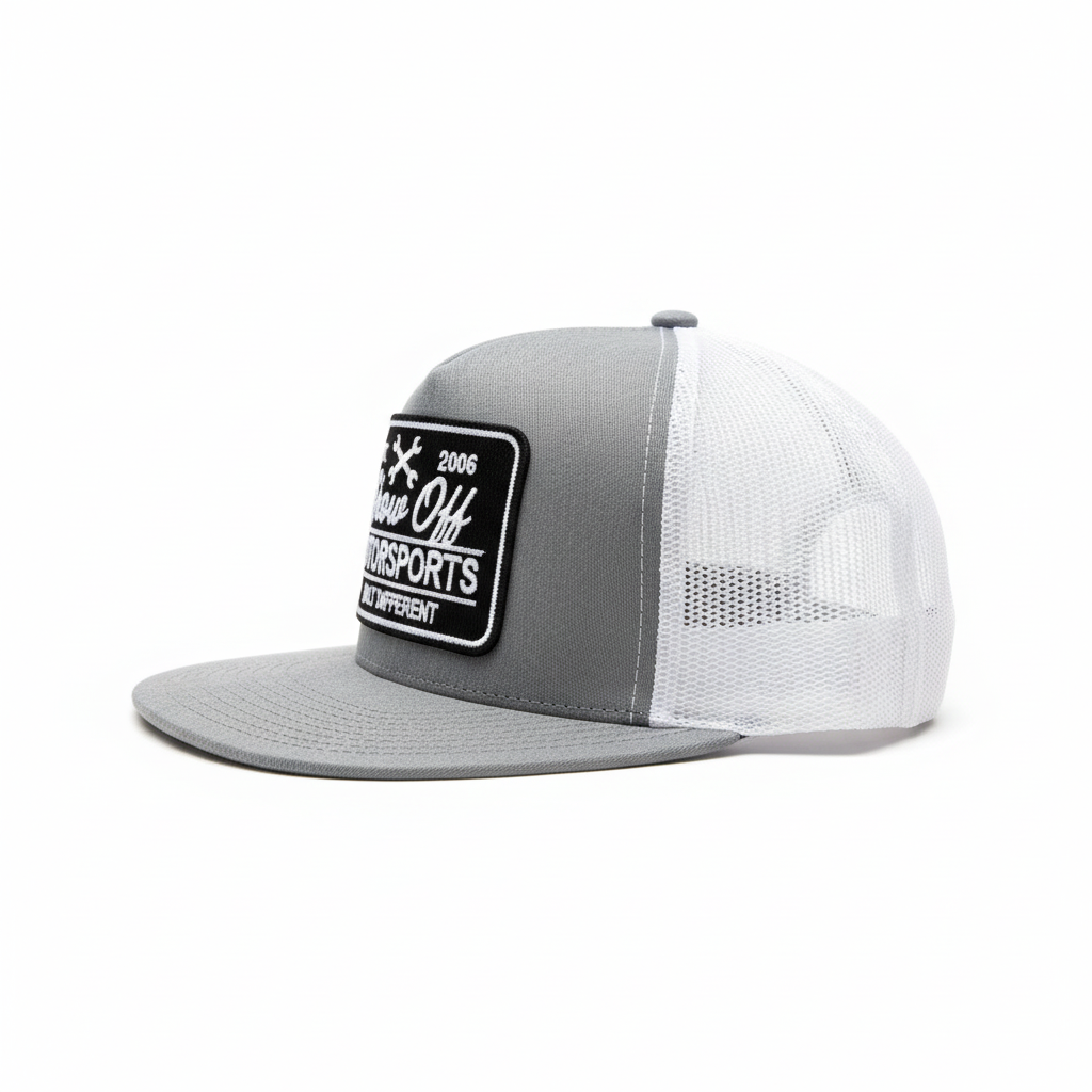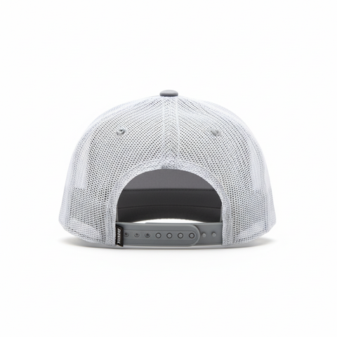 Adjustable snapback and trucker hat featuring a heathered grey hat and white mesh color way. NEW built different patch logo